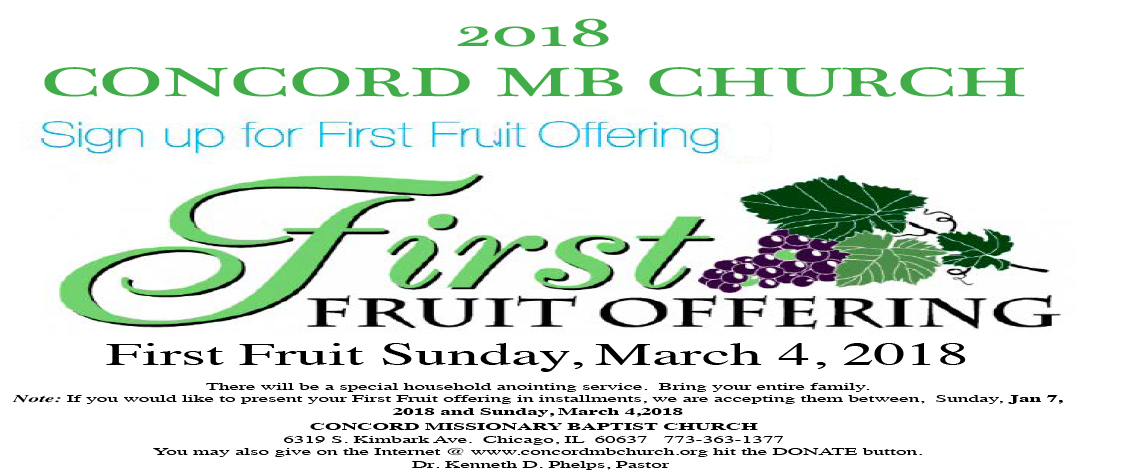 First Fruit Sunday will be Sunday, March 4, 2018. Please fill out the  attached form and place it in the offering plate, ASAP or email it to Sis. Veneeta Phelps @ veneetap@comcast.net.  You can begin to set aside your seed or sow your First Fruit in  installments to the Lord.